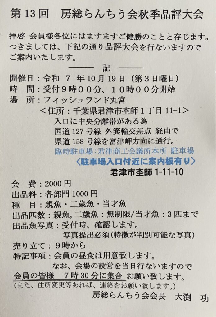 日本らんちう協会 東部本部 房総らんちう会 第十三回秋季品評大会のご案内